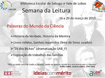 Este ano a temática escolhida é “Palavras do Mundo da Ciência”. Será uma semana onde todos os ciclos de ensino e as famílias andarão de mãos dadas com a leitura e a ciência.