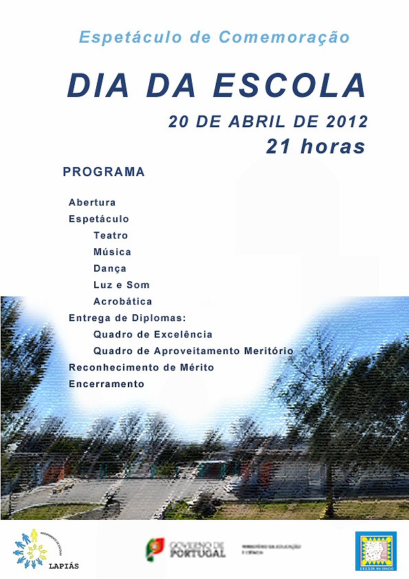 Realizou-se no dia 20 de Abril de 2012, a cerimónia comemorativa do Dia da Escola, relativa à EB 2,3 Dr. Rui Grácio. Associadas a esta cerimónia comemorativa que esteve aberta a toda a comunidade educativa, decorreram diversas actividades. Consulte aqui o cartaz de relativo à divulgação do evento. Entre as diversas actividades realizadas ao longo deste evento, foram entregues os Diplomas de Mérito e Excelência por Aproveitamento, relativos ao ano lectivo de 2010/2011.