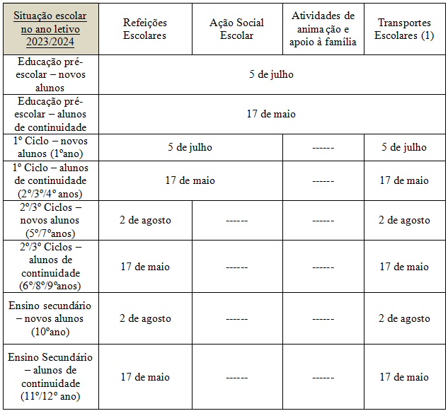 Informa-se de que as candidaturas para o ano letivo de 2023/2024 às medidas de Ação Sócio-educativa do município de Sintra (refeições escolares, ação social escolar, atividades de animação e apoio à família e Transportes Escolares) estão disponíveis a partir das datas que se encontram no quadro seguinte: