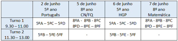 Informa-se que em virtude de se realizarem as provas de Aferição dos 5º e 8º anos nos próximos dias 2, 5, 6 e 7 de junho, nestes dias apenas terão aulas da parte da manhã os 9ºs anos e as turmas de CEF CD e Curso Profissional de Secundário. Para as aulas destas turmas poderá haver alteração de salas.